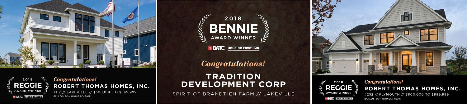 Robert Thomas Homes is proud to announce that we have earned two Reggie Awards from the Builders Association of the Twin Cities (BATC) – Housing First Minnesota for our model homes in the 2018 Fall Parade of Homes℠. We’d also like to congratulate Tradition Development for taking home the Bennie Award for the Spirit of Brandtjen Farm neighborhood in Lakeville which recognizes excellence in neighborhood design and construction. The coveted Reggie & Bennie Awards were announced at BATC-Housing First Minnesota’s Building Industry Gala (BIG) Night held on Oct. 25, 2018, at the Mystic Lake Showroom in Prior Lake.