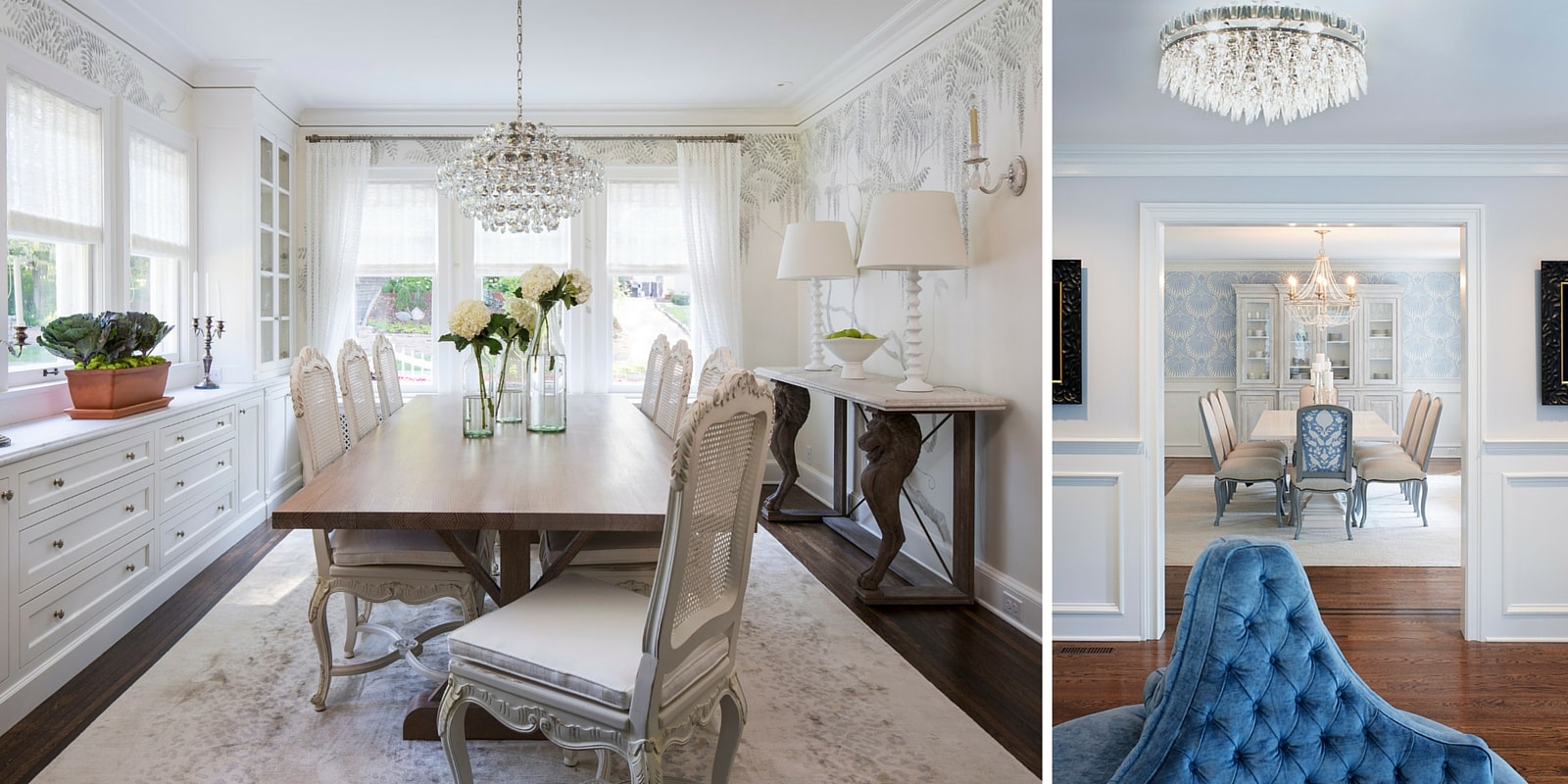 Using soft patterns in neutral tones, formal spaces such as the dining rooms above take on a quiet elegance that is rarely achieved by paint alone. The above images are proof positive that a wallpaper does not have to be bright or bold to transform a room.